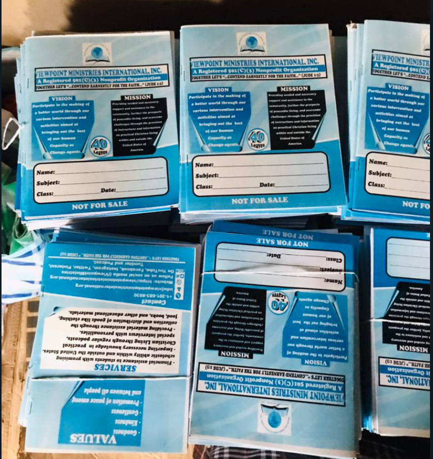 Viewpoint Ministries International is committed to providing material assistance through collecting and distributing goods like clothing, food, books, and other educational materials. In December 2022, with donations from our generous donors, Viewpoint Ministries and its volunteers organized the purchase of 1200 custom notebooks and ink pens which were distributed to 350 promising young students in Nigeria. The school outreach ministry supports students with promising scholastic abilities domestically and abroad.